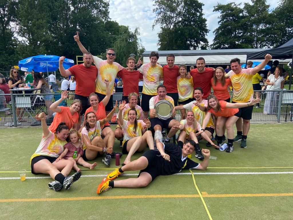 Op de dag zelf waren de AC en de Feestcie al vroeg uit de veren om alles klaar te zetten. De Feestcie (Mark, Koen, Bas, Sandra, Megan, Sabine en Robin) heeft een mooi schutterstoernooi voor de jeugd georganiseerd waaraan zo’n 50 jeugdleden mee hebben gedaan. Een heuse limonadekoe en niet één maar twee springkussens maakten het feest compleet. In de middag het mixtoernooi met 16(!) teams, waaronder maar liefst 3 teams van ouders uit de F t/m D teams (Effe ballen, en CD van jou CD van mij 1 & 2). Lucie, Colin, Raven, Sylene en Tessa hebben zich de hele dag uit de naad gewerkt om het mixtoernooi in goede banen te leiden, tafels neer te zetten en weer op te ruimen, af te wassen etc.)